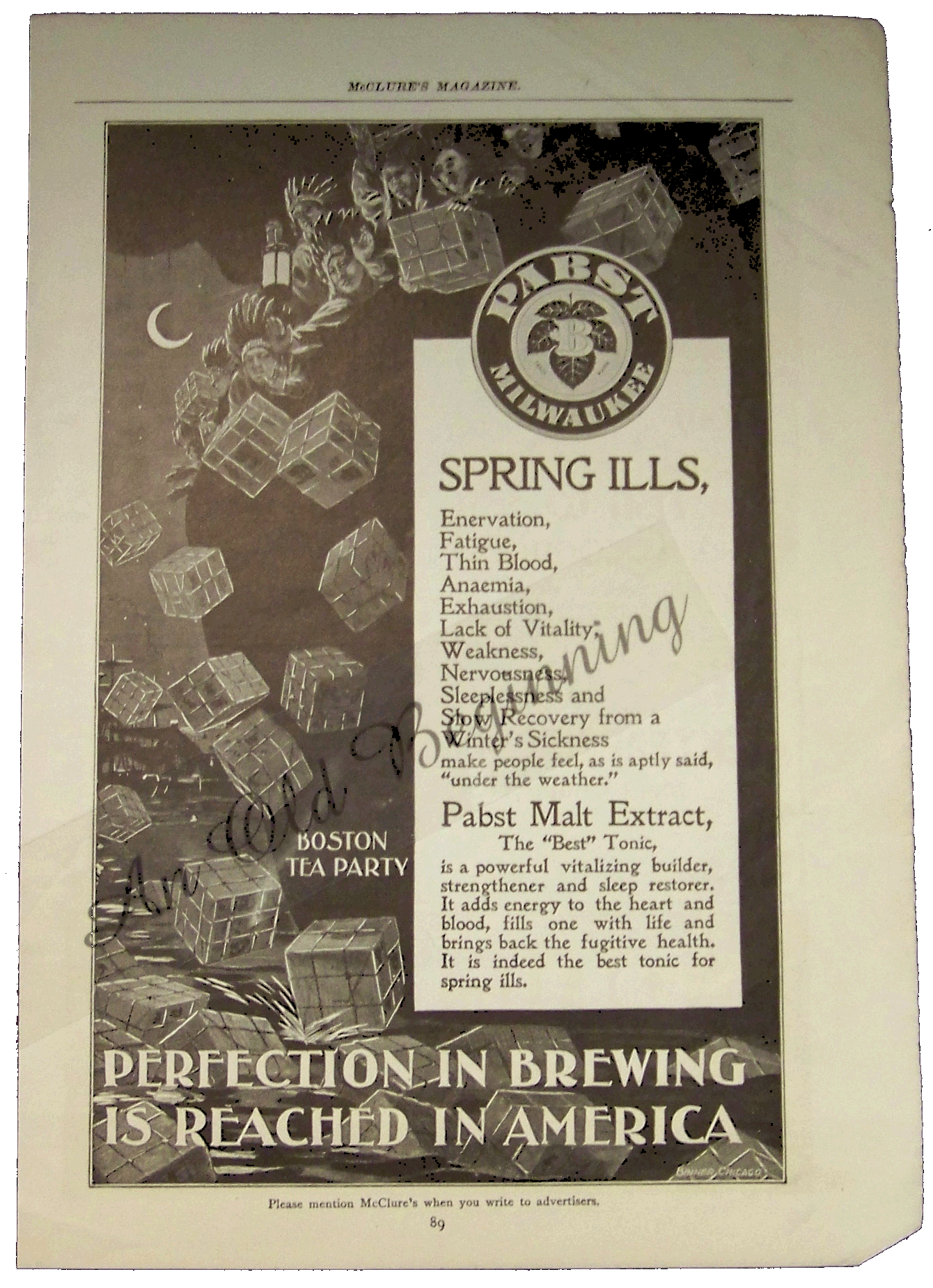 Pabst Malt Extract Milwaukee from Mclures Magazine 1897 picture depicting the Boston Tea Party, Indians throwing boxes of tea overboard, artist Binner Chicago Condition; Very good one corner folded Price: $20 Item: TSH 7