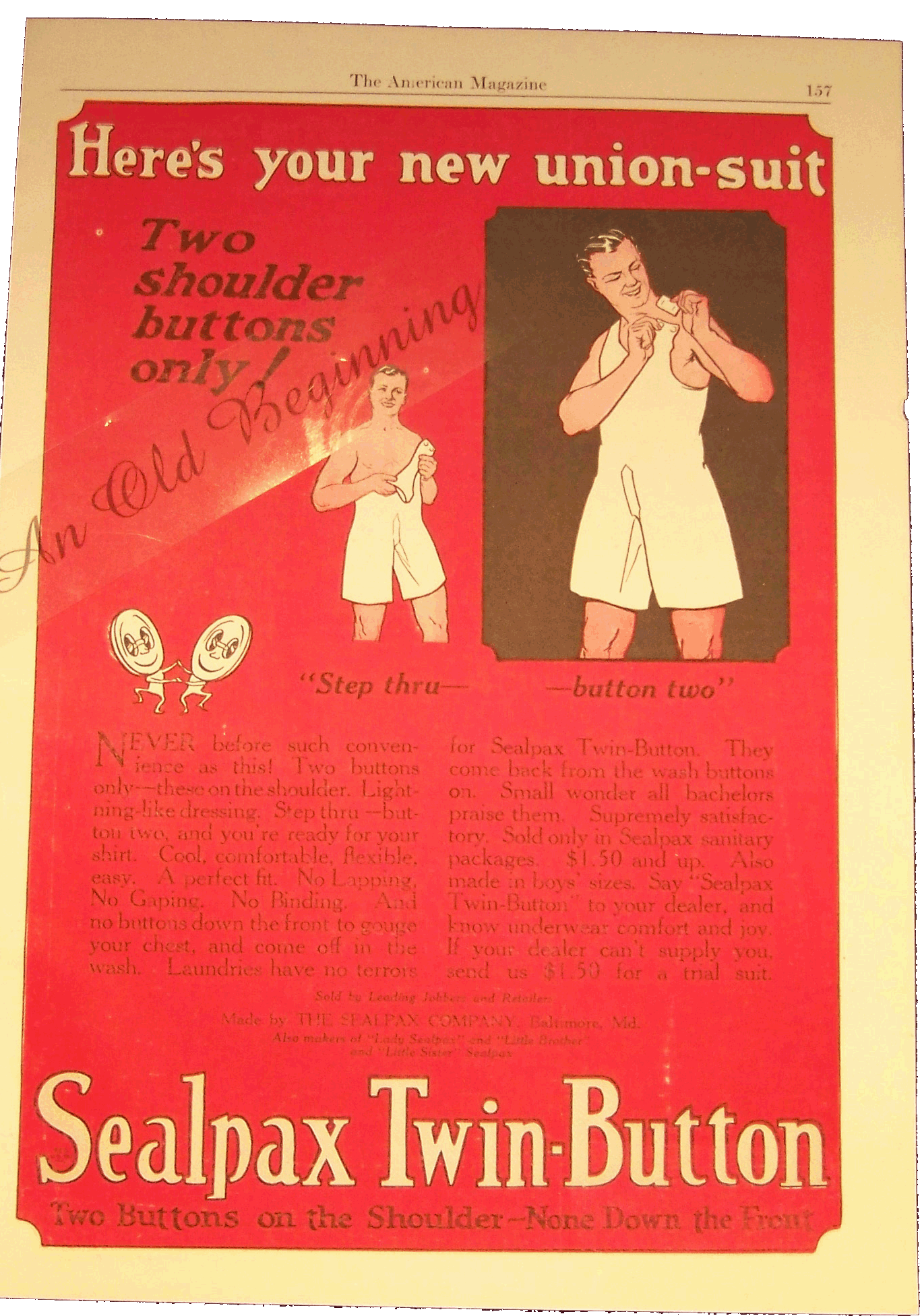 Union Suit Sealpax Twin-Button the Sealpax Company Baltimore Md from American Magazine Condition: Good there is a little sign of wear on the lower part. See picture Price: $8 Item: TSH 4