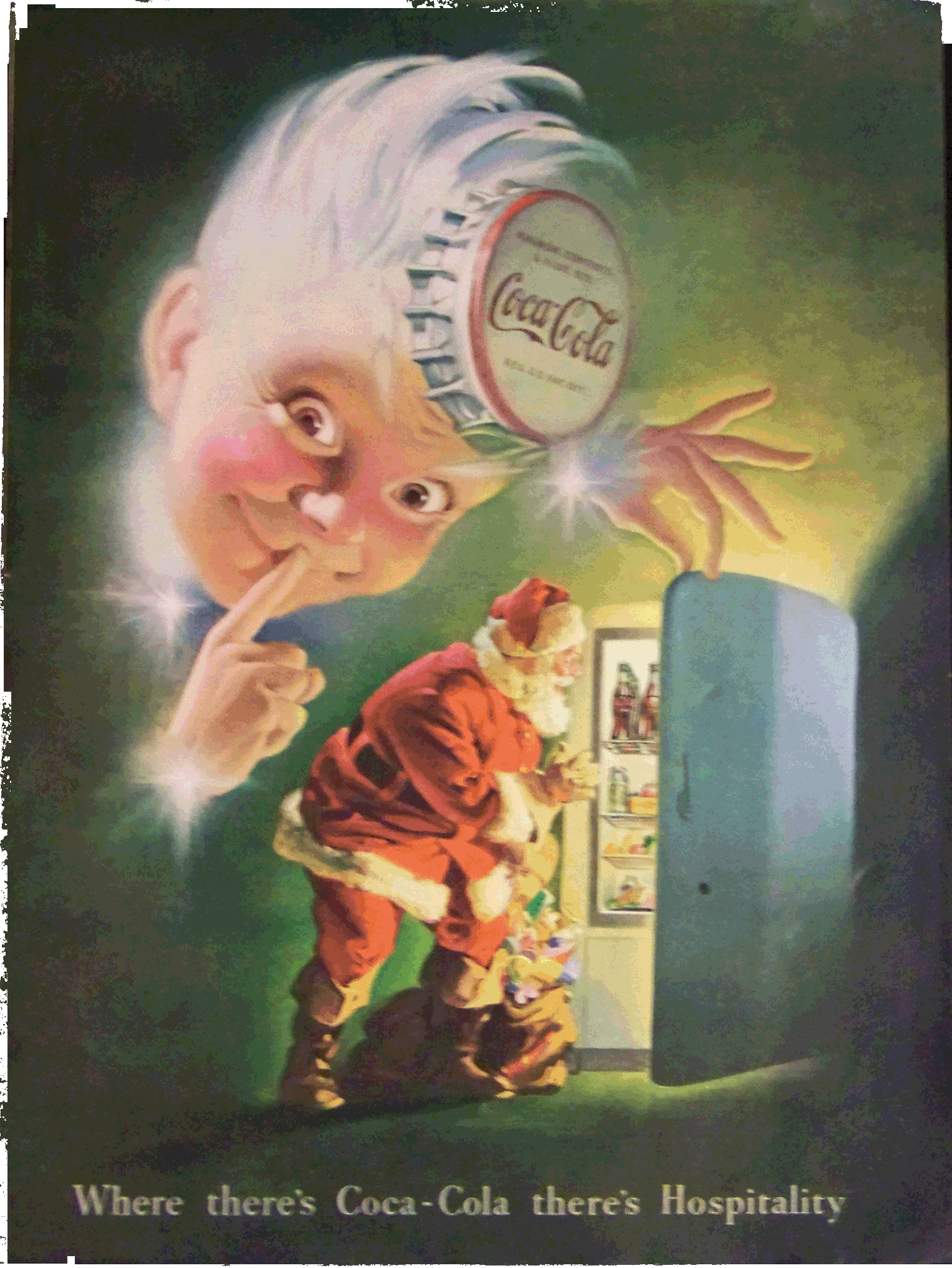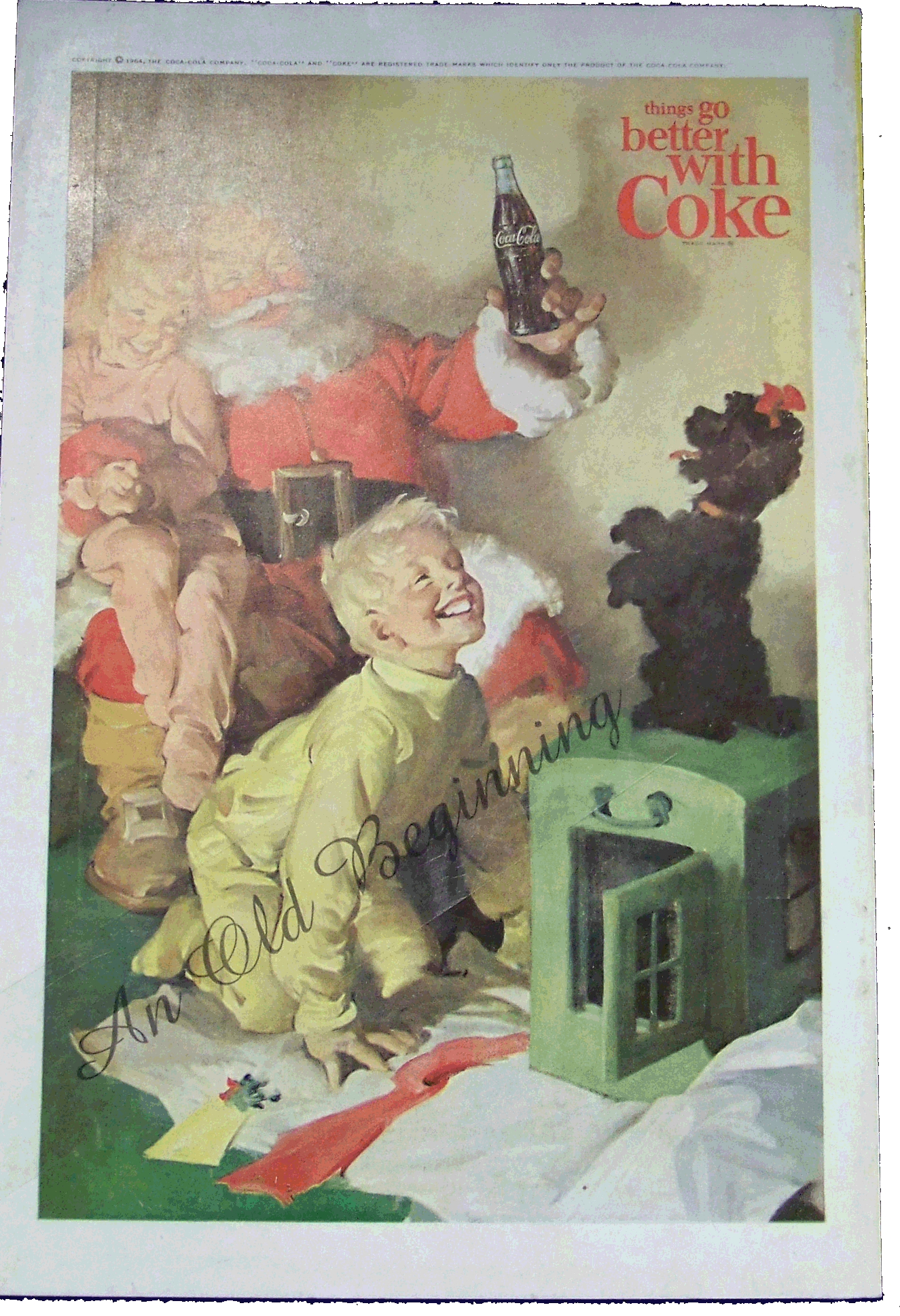 Coca-Cola Santa little girl sitting on his lap. Little boy with black poodle that had been unwrapped. December 1964 Condition: Fait to good some water spots on the white sides Price: $7.50 Item: TSH 3
