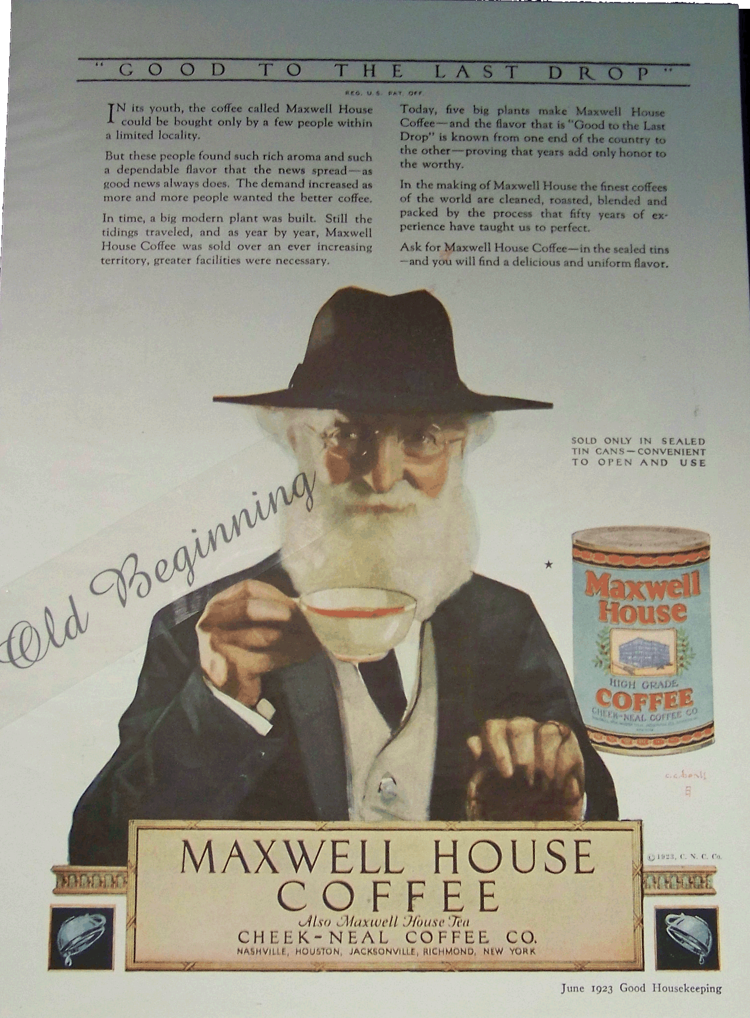 Maxwell House Coffee Good Housekeeping 1923 Old man with beard holding a cup Artist C.C. Beall