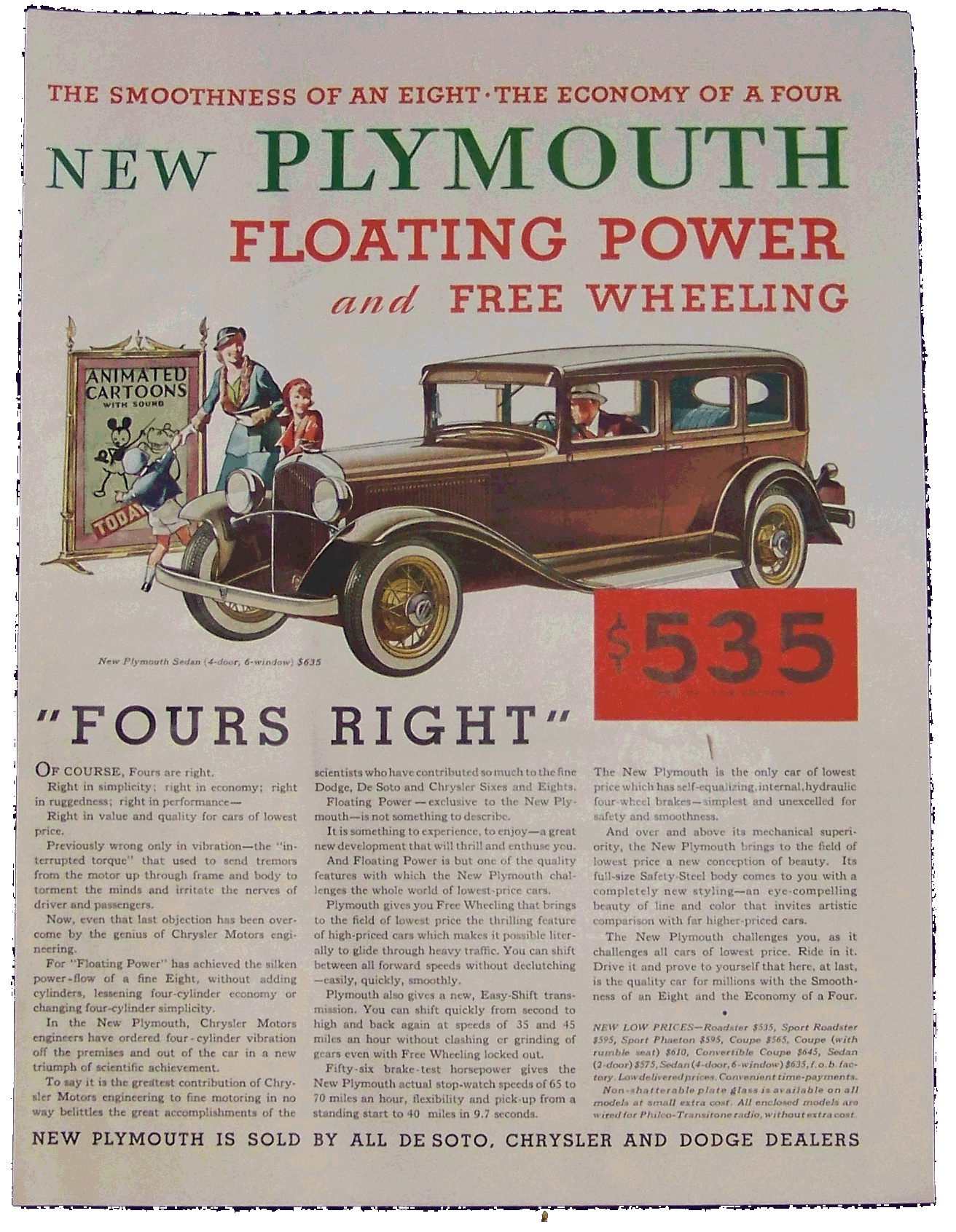Plymouth 1931/1932 ? Has an ad for Micky Mouse Cartoon in background Condition: take a close look it has a few wrinkles Price: $8 Item: TSH 9