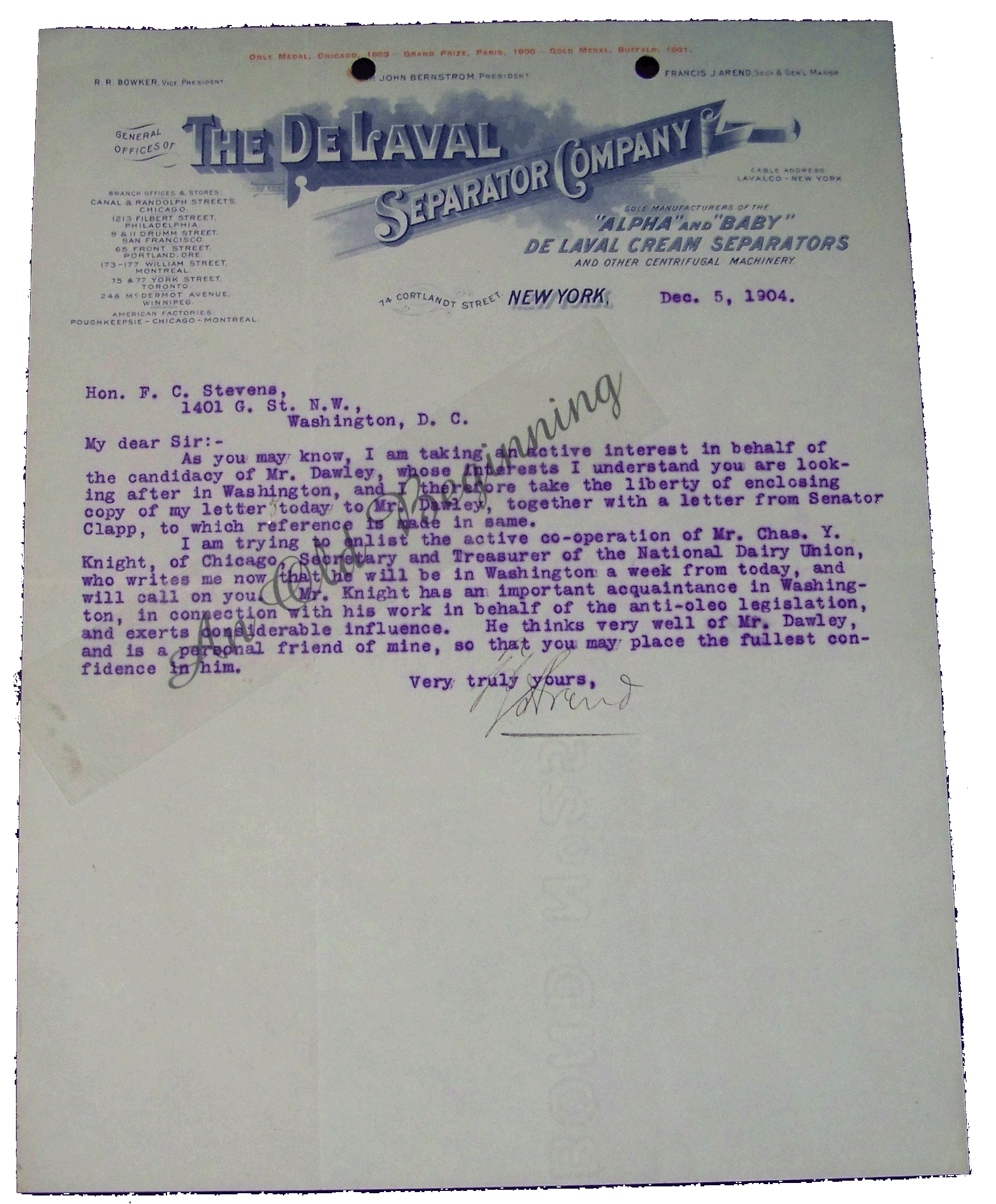 The De Laval Separator Company Alpha and Baby De Laval Cream Separators and other Centrifugal Machinery Dec 5,1904 Cortland Street, New York Written to Hon F C Stevens Washington DC From Francis Arend about the candidacy of Mr. Dawley and anti-oleo legislation. Condition: Fine Price:$15 Item BHD 5