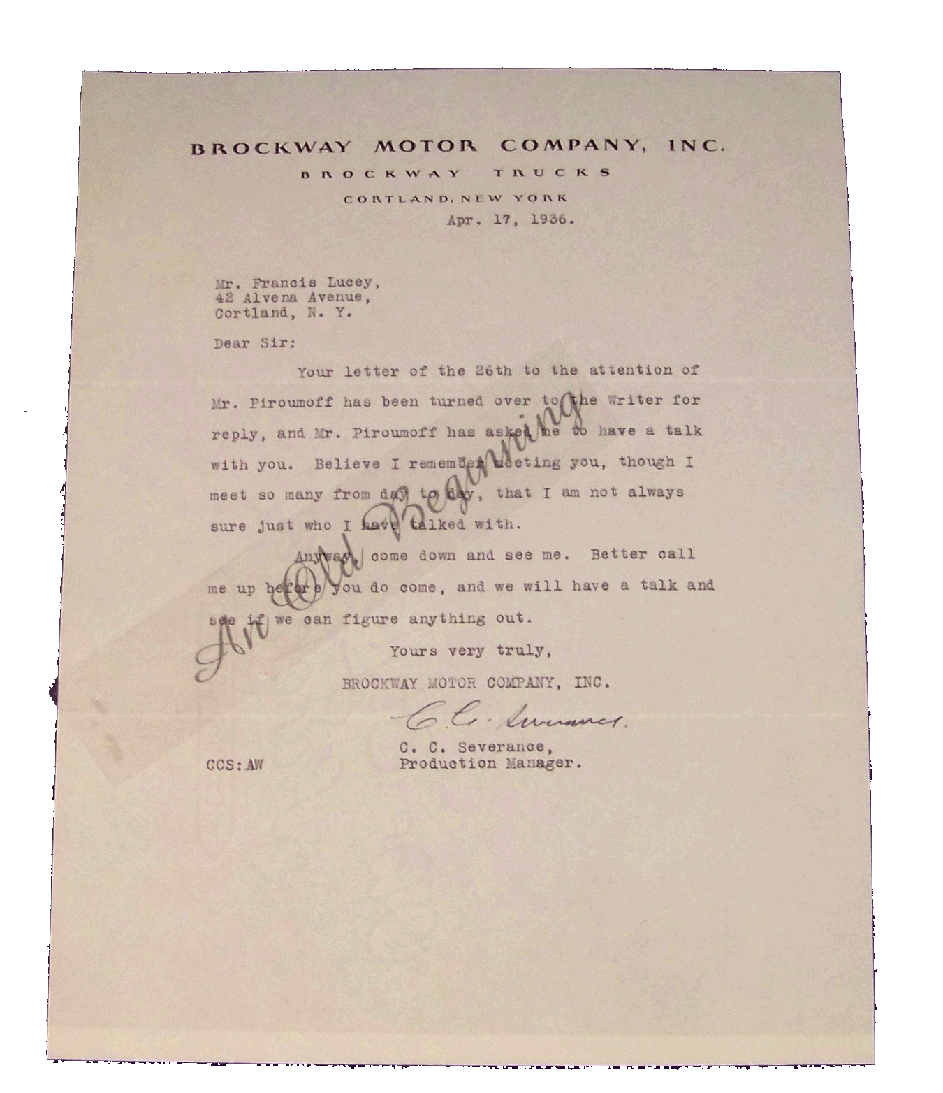 Brockway Motor Company Inc letter Apr. 17,1936 from Brockway motor production manager, C.C. Severance Production Manager Condition: very good Price: $9 Item BHD 4