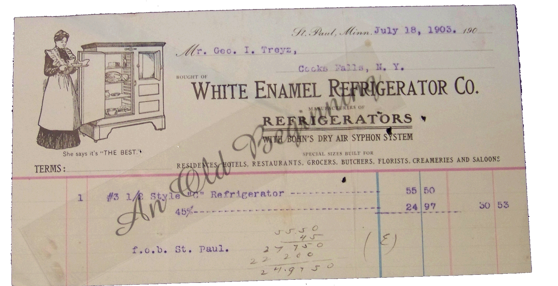 White Enamel Refrigerator Co St Paul Minn July 18, 1903 Woman next to Refrigerator Condition: some staining Price: $12 item: BHD 1