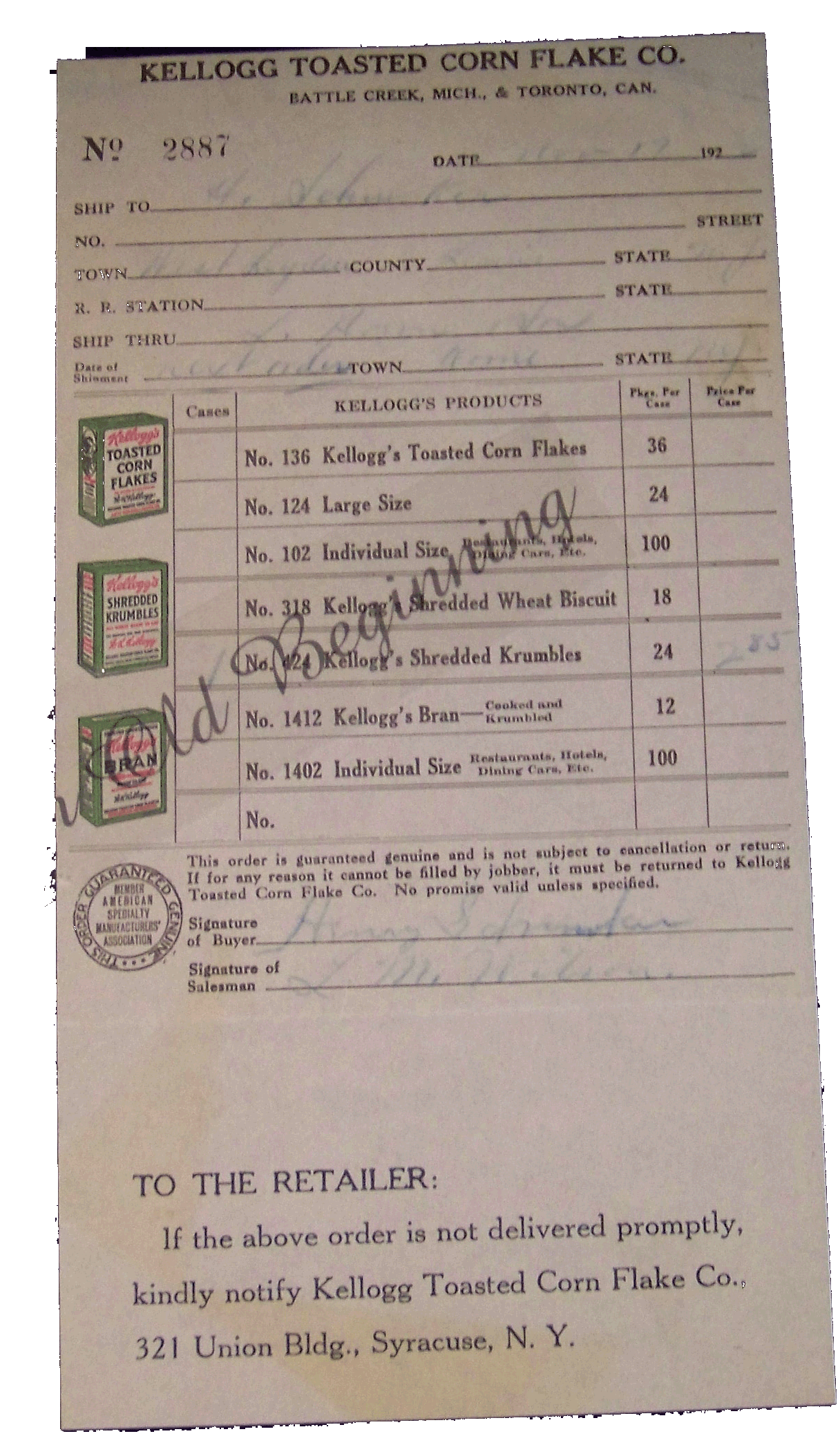 Kellogg Toasted Corn Flake order form 1922 For Retailers orders by the case Nov 17,1922