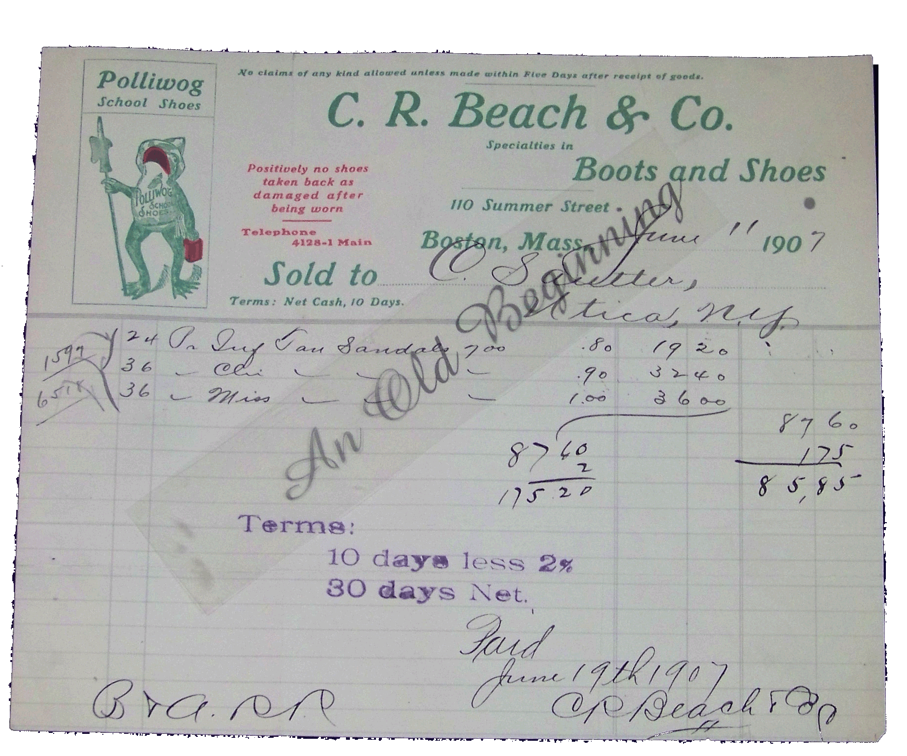 C.R. Beach & Co Boots and Shoes Polliwog School Shoes June 11, 1907 Summer Street, Boston Mass Condition: Very Good Price: $10 Item: BHD 2