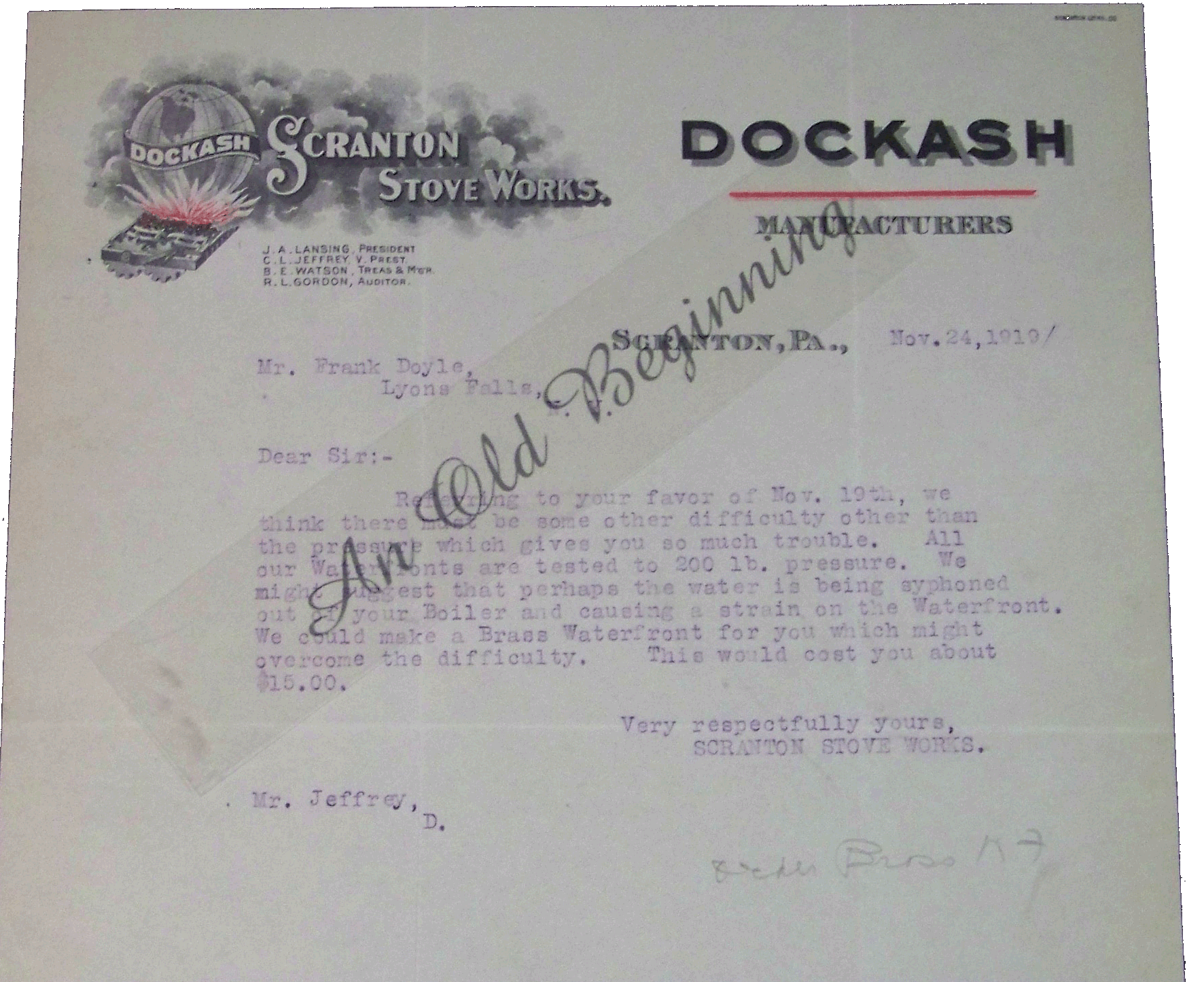 Dockash Scranton Stove Works letter from Nov 24,1919 World with fire under the world Condition: Very Good Price: $8 Item: BHD 7