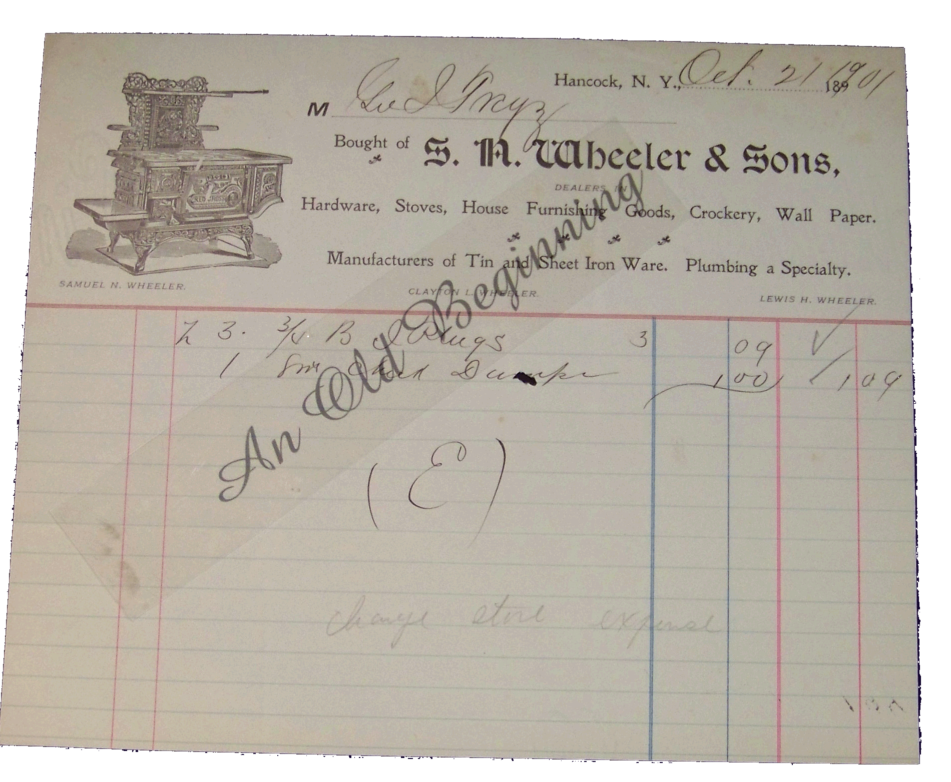 S N Wheeler & Sons Hancock NY October 21,1901 Stove on the billhead