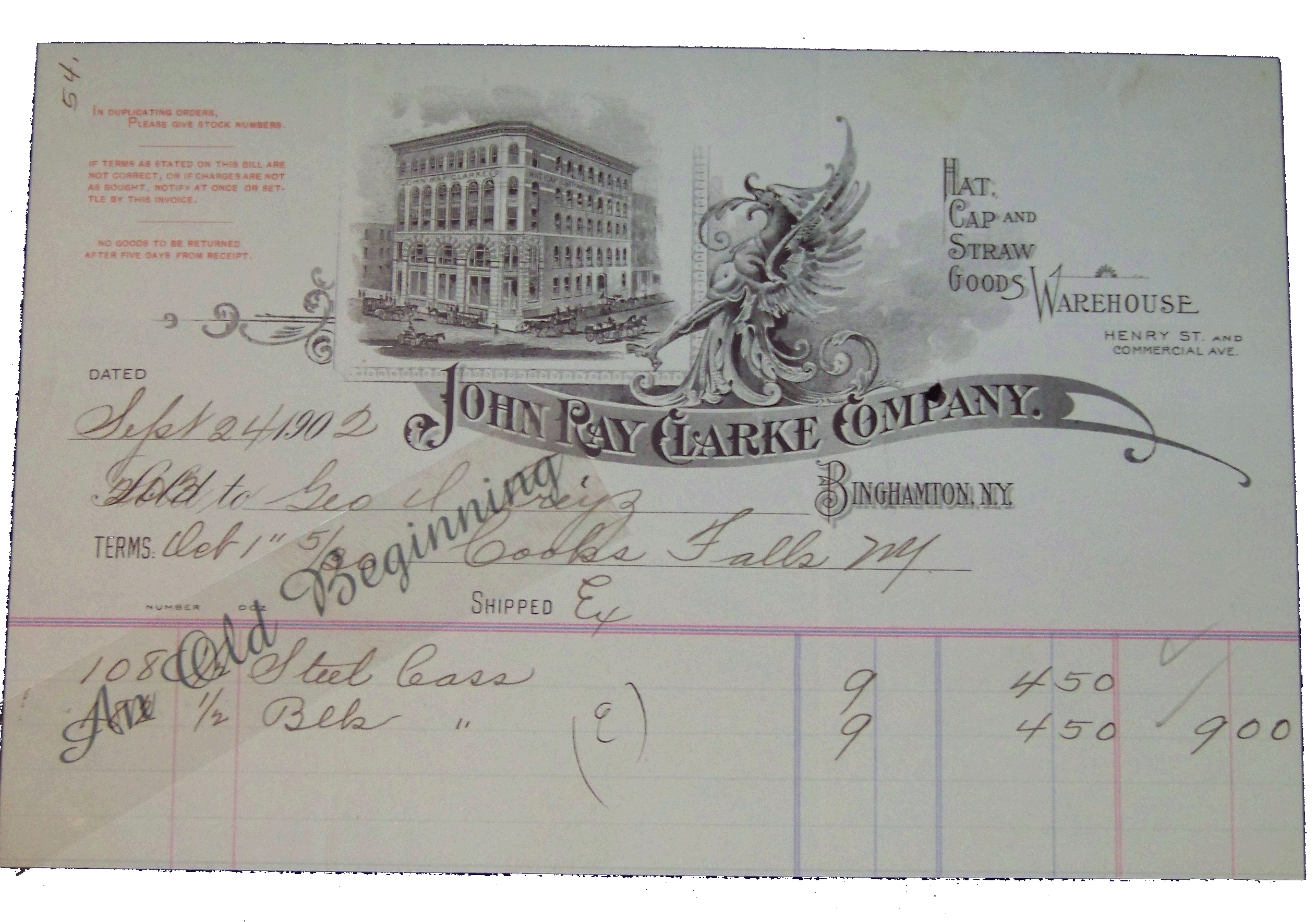 John Ray Clarke Company Hats Cap Straw Sept 24,1902 Binghamton NY Very nice graphics couple of small holes in it