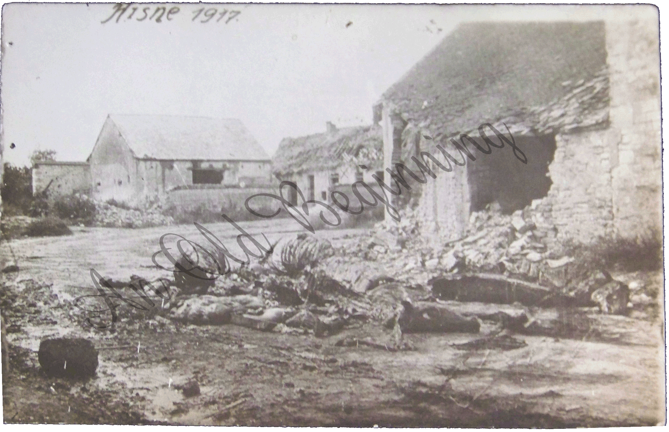 Real Photo WWI hand written "Hisne 1917 " Shows a bombed building/burned Horses/Bodies? Condition: Good a pin hole in top center Price: $28 Item: PCD 16