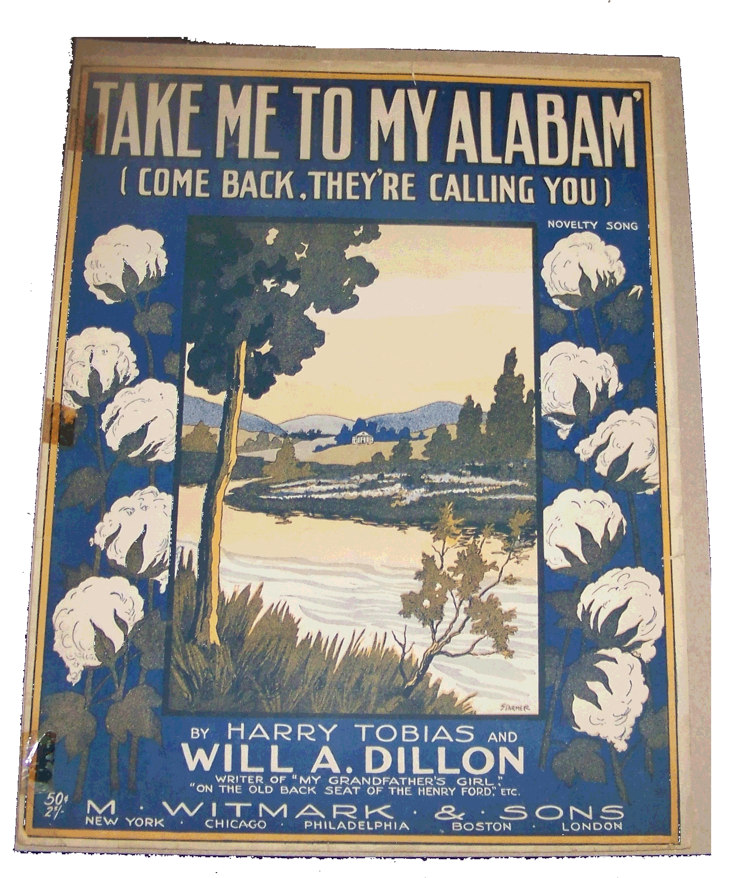 Take Me To my Alabam' (Come Back They're Calling You); by harry Tobias and Will A. Dillon 1926 Illustrator Condition: It has been taped in three location Price: $4 Item: SMC 9